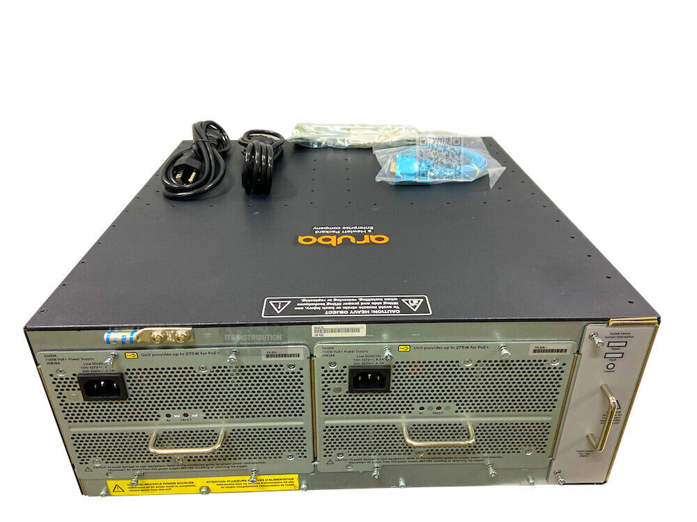 J9850A switch loaded with 2x J9827A management modules, 1x J9831A fan tray, 2x J9828A power supplies, 4x J9538A modules, 2x J9536A modules. May include 3rd party module and power supply slot covers. Unit may be HP (grey) or HPE Aruba (black).