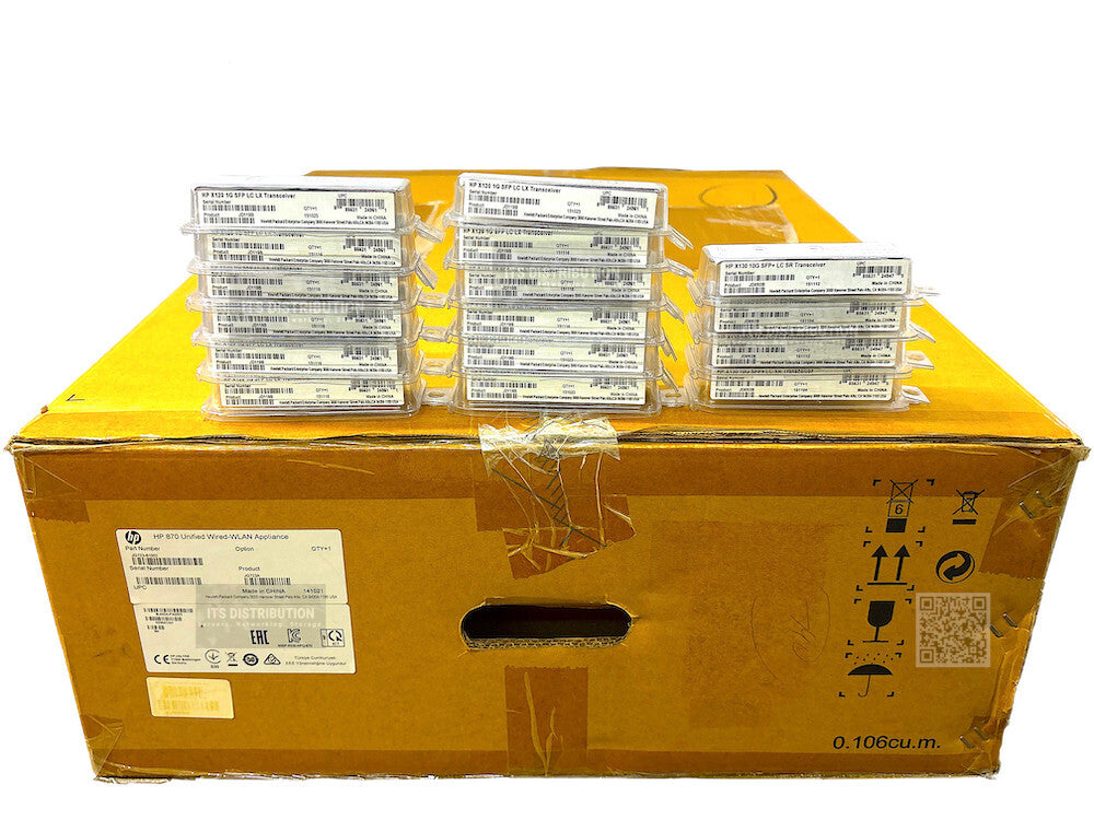 Listing includes 1x JG723A wireless LAN controller, 4x JD092B SFP+ transceivers, 12x JD119B SFP transceivers.