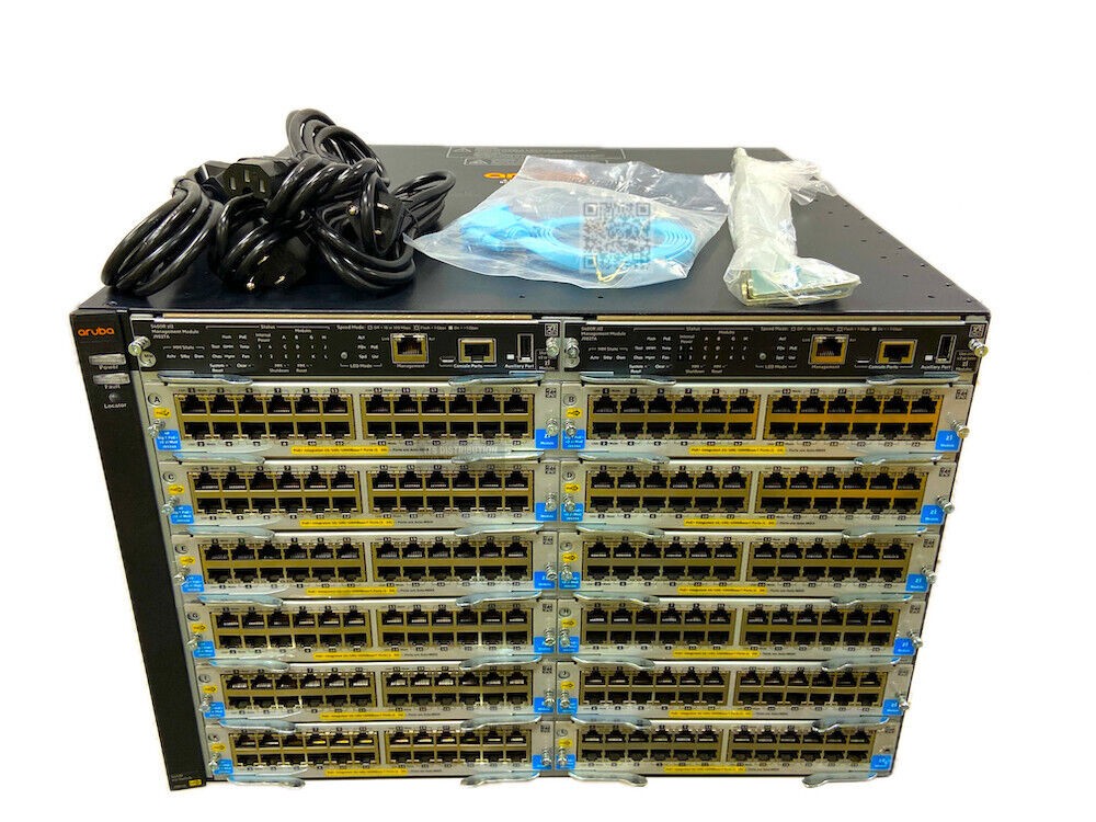 J9851A chassis loaded with 2x J9827A management modules, 12x J9534A 24-Port GIG-T PoE+ V2 ZL modules, 4x J9828A 5400R 700W POE+ ZL2 power supplies. Professionally cleaned and tested to industry standards. Listing may include stock images, please contact us for confirmed photos of our inventory.