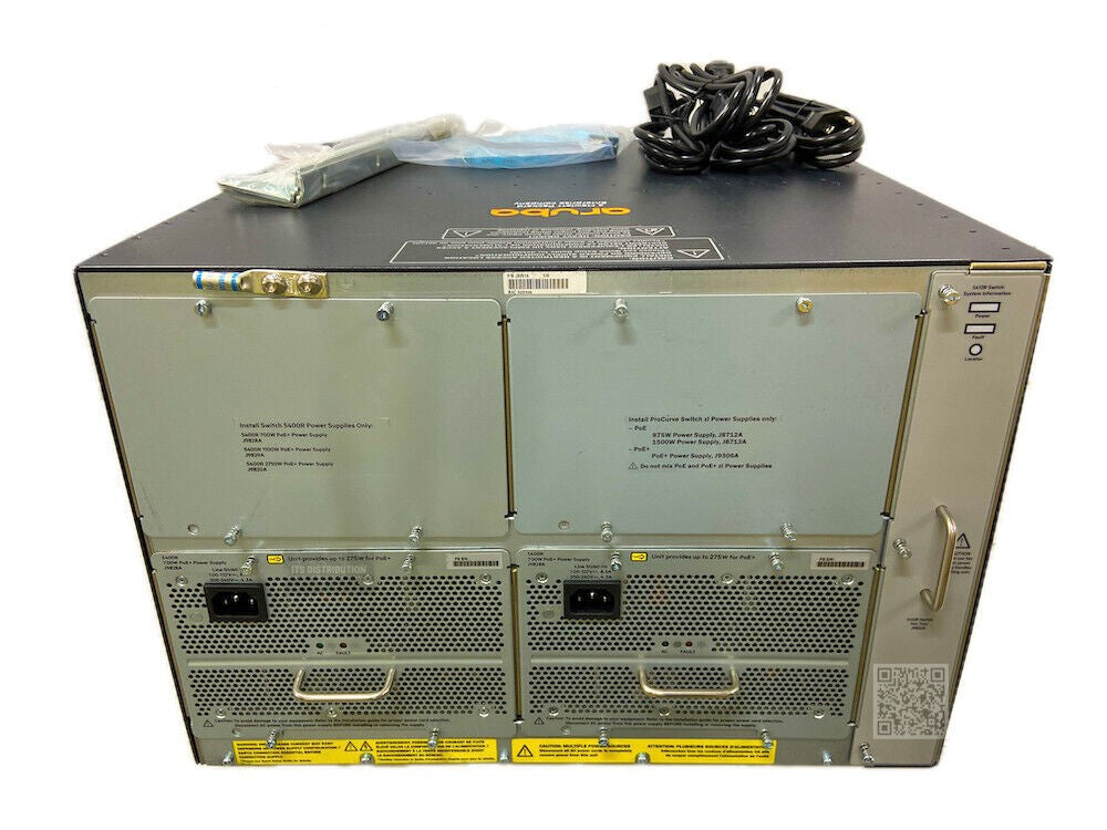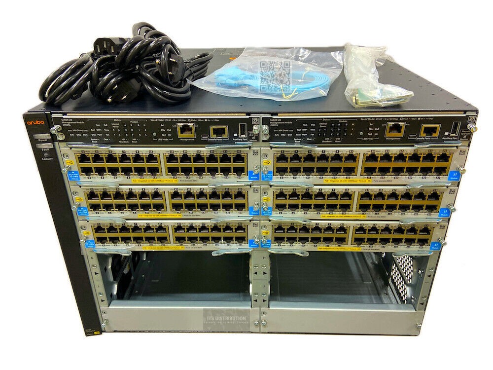 J9851A chassis loaded with 2x J9827A management modules, 6x J9534A 24-Port GIG-T PoE+ V2 ZL modules, 2x J9828A 5400R 700W POE+ ZL2 power supplies. Professionally cleaned and tested to industry standards. Listing may include stock images, please contact us for confirmed photos of our inventory.